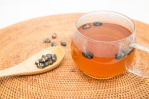 写真のような黒豆茶は、もともと炒って売っている黒豆を使用して簡単に作れます。炒り黒豆にお湯を注げば出来上がり。もちろん、炒っていない黒豆から本格的に作る方が栄養価があるのでしょうが、手間がかかりすぎてとりいれにくいなと思ってしまうタチでして、少し栄養価が下がっても続けられる方を選んでしまいます。