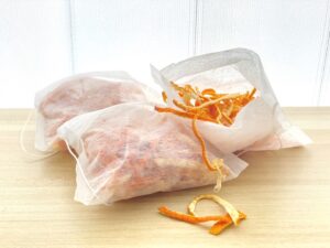 - みかんの皮でお風呂用陳皮つくり(上の写真は無農薬みかんの皮をハサミで切り乾燥させたもの)